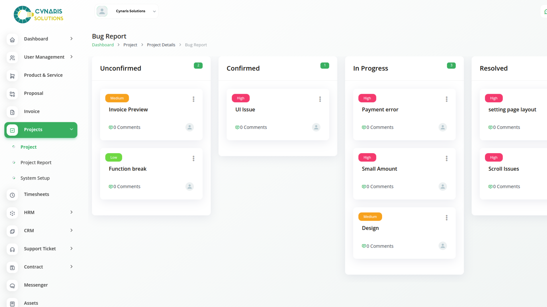 Create new bugs and assign users and priority to them. You can write a note in the text box for the bug description. Also, the status of each bug could be changed through an easy drop-down and Kanban drag system.